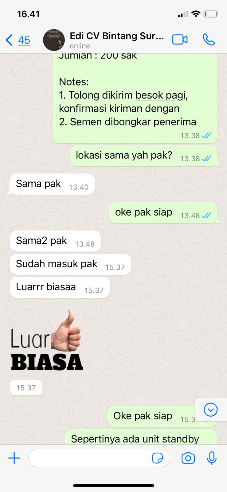 Bagi anda yang butuh semen dengan kondisi urgent, kami bisa mengusahakan pengiriman yang lebih cepat karena untuk pengiriman kami memiliki armada pengiriman sendiri sehingga bisa memberikan pelayanan pengiriman lebih cepat